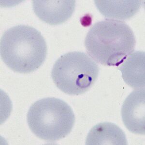 - The residual membrane (empty of haemoglobin) is often seen as a "blister" to the side of the parasite