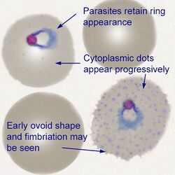 The earliest ring forms in this species may be indistinguishable from other species, but during the early trophozoite stage the parasite begins to aquire a more irregular forms and to modify the erythrocyte and added dots, altered size and shape begin to be present.