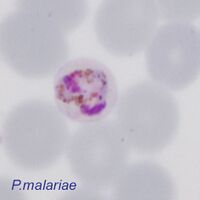Estos cambios pueden no ser evidentes en la etapa temprana del trofozoíto y varían entre especies, pero generalmente se detectan en la fase tardía del trofozoíto (como se muestra en la imagen de un trofozoíto tardío de P. malariae).