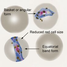 In this species the parasite form changes significantly as the mature, characteristically elongating or becoming more angular, red cells may often appear smaller though not distorted.