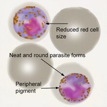 • Haemoglobin is absent and scattered pigment overlies or surrounds the gametocyte