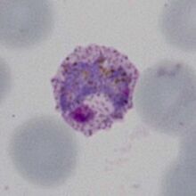 - a range of maturing schizonts will generally be present within enlarged red cells