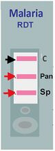 Shown below is an RDT test. This uses a pan-malarial antibody (labelled Pan) and a P.falciparum species-specific antibody (labelled Sp). The test has been used to assess a patient and the positive bands are shown on the figure.