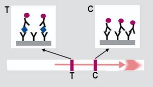 If dye-labelled malaria-antigen/antibody complex is present then it will be "captured" by immobilised anti-malarial antibody that also binds the labelled immune complexes. Since there is dye attached to the first antibody this produces a visible line (a positive test line T). The remaining sample containing labelled antibody only continues to diffuse along the strip and is captured by a second antibody to form a control line (C). This control line simply indicates that test has been successfully performed.